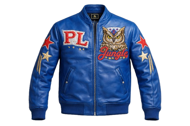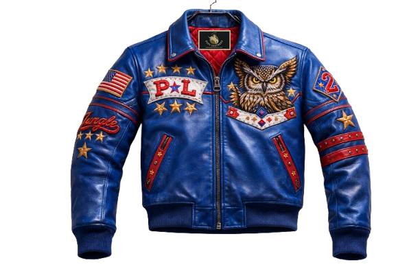 Crafted from premium-quality genuine leather, this royal blue jacket combines classic varsity inspiration with striking embroidered artistry.