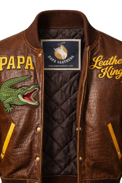 The body features richly textured brown cow genuine leather croc-pattern embossed, giving the jacket a luxurious, high-end look and durability that improves with wear. The contrasting golden-yellow sleeves add a sporty varsity feel, while rib-knit cuffs, collar, and hem provide a snug, comfortable fit. Signature embroidered artwork — including the striking alligator patch and “Papa” varsity lettering — delivers standout personality, making this jacket more than outerwear… it’s an identity.